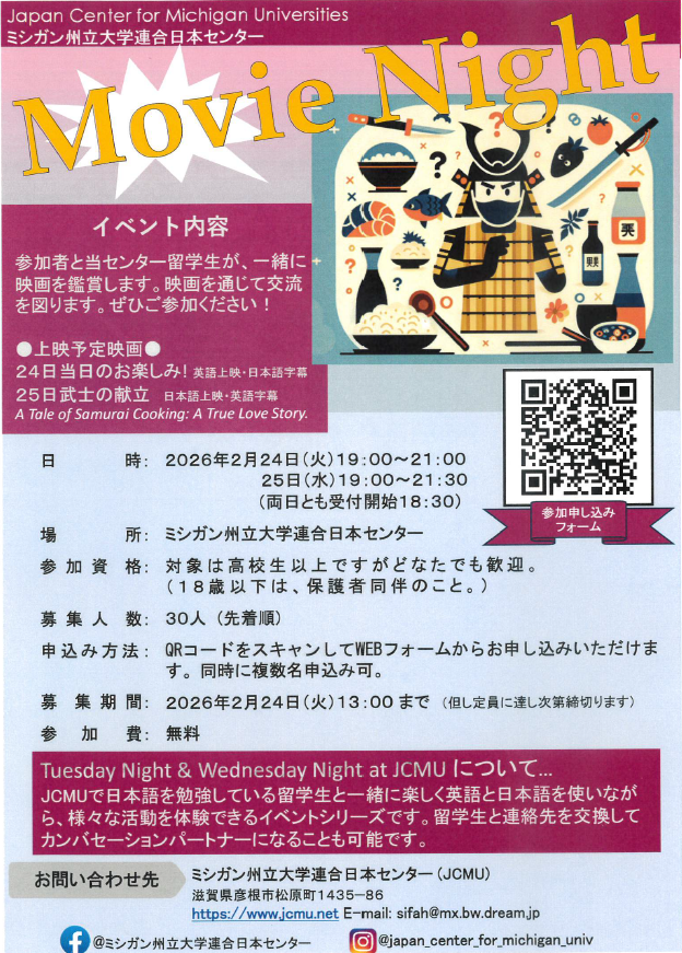 - 予定映画: 2月24日 当日のお楽しみ (英語上映・日本語字幕) 当 2月25日 武士の献立 「 A Tale of Samurai Cooking - A True Love Story」 (日本語上映・英語字幕) セ
